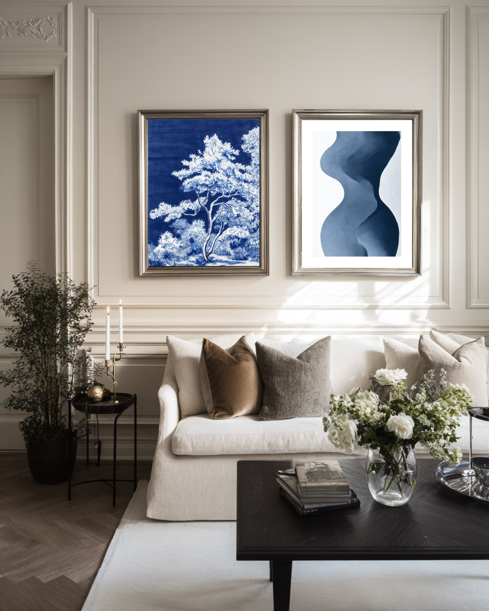 Abstract female body shape in muted matte dark blue. A minimalistic art print, perfect to mix with other posters in blue tones.