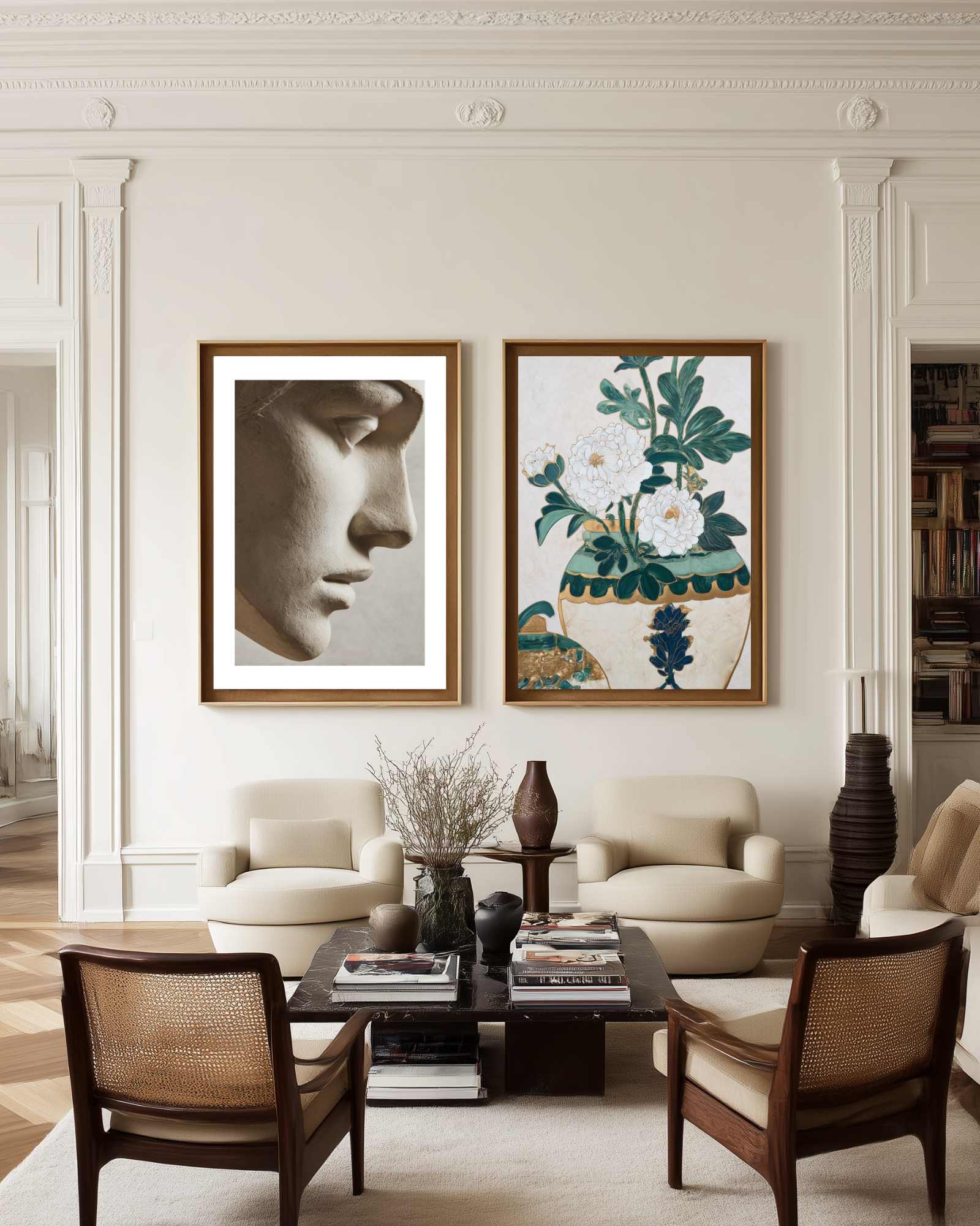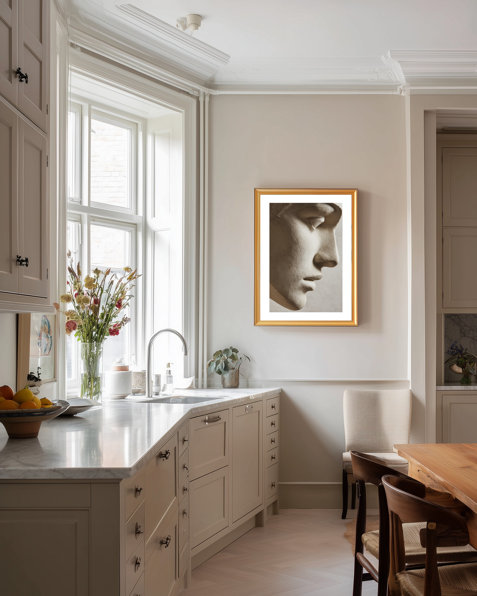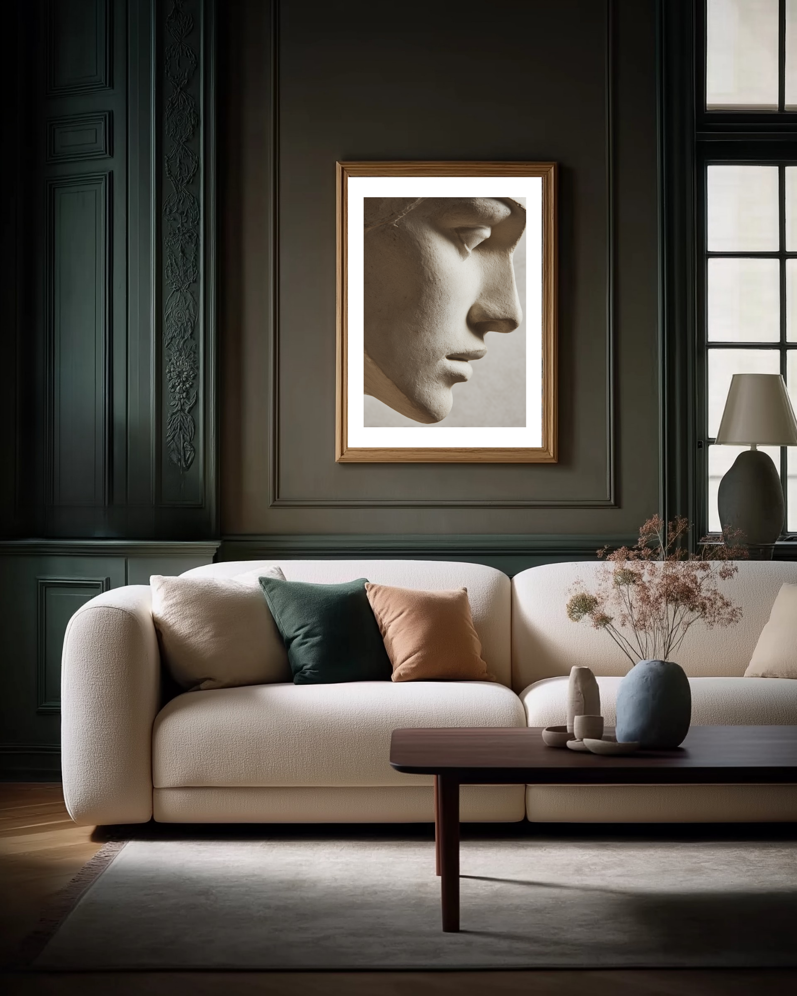 The profile of a stone statue's face, a neutral colored photography art print. This sophisticated sculpture poster is perfect for any room with a minimalist interior decor.